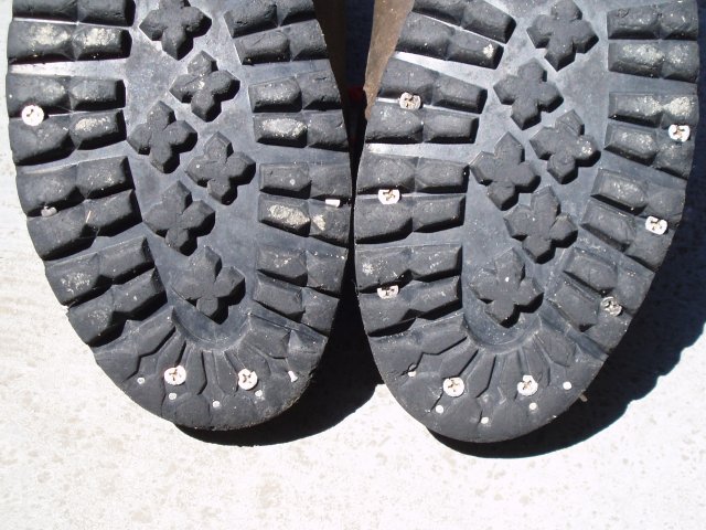 重荷の為、少しでも楽をしようと、別山乗越しへの直登をさけて左の稜線から回り込むコースをとる。少し登り始めるとアクシデント発生、登山靴のビブラムが剥がれはじめ、アカンベー状態になってしまった。それも両足とも。 20年ちょっと前の靴とは言え、この間の古賀志の岩トレではそんな兆候は無かったぞ、何もこんな時に、まったく! とりあえず手持ちのアイゼンバンドで縛り付けて見るが、少し歩くと外れてしまう。中嶋さんの紐とか、ゴムとかを借りたりして縛り付け、だましだまし御前小屋まで歩く。 針金で縛り付けるのが良いのでは言う中嶋さんの助言で、小屋の廻りをうろうろして、錆びた番線を拾いそれで応急処置。意外と落ちているものだと少し感心する。