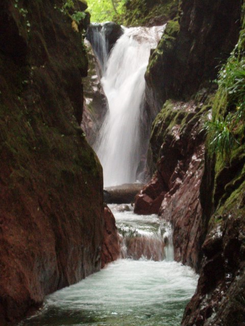 | 物見山登山道が湯沢を横断する所から入渓。 すぐの6m滝は左を巻き落口に降りる、少し行くとゴルジュとなり奥の8m滝が見える。 この間カラノマタ沢下降で巻き降りたところだが、今日は水量豊富で一段と迫力があります。 |