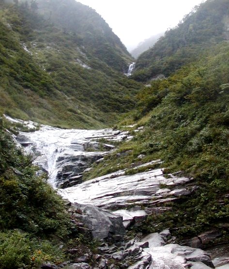 | しばらく進むと水枯れ、ここで雨が落ちてくる。 10:50-11:00 結局核心部は時折日差しがさすような天気の中を遡行する事が出来て、ラッキー! しかし、この先のクマザサの藪こぎはつらかった。 |