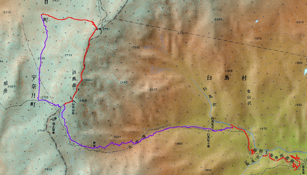 青:滑り、赤:つぼorシール 滑り出してからのデータ2726脇のコルから滑り出して、平になった所からトラバース気味に行ってしまったが、そのまま2400m下辺りの平らなとこまで滑った方が良かったみたいです。*この地図は、国土地理院2万5千分の1地形図ベース、山旅倶楽部及びカシミール3Dを使用して作成したものす。